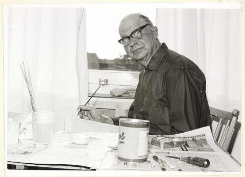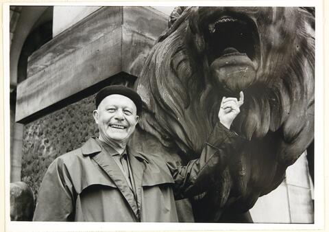 Carl Buchheister kitzelt einen Löwen am Kinn