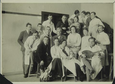 Ganzfiguriges Gruppenbild von Tappert mit 18 StudentInnen. Georg Tappert ist in der Mitte der Gruppe im Anzug zu sehen. Um ihn scharen sich die jungen Leute, teils auf Holzhockern sitzend, teils stehend. Die meisten tragen weiße Malerkittel, vier junge Männer sind im Anzug zu sehen, eine junge Frau in der Mitte trägt einen Wollpullover. Im Bild sind auch verschiedene Utensilien des Unterrichts wie ein ausgestopfter Hahn im Vordergrund, eine Laute und eine Gitarre zu sehen.