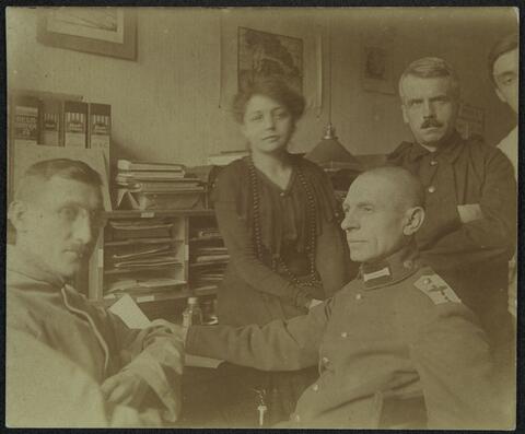 <h3>Kurzbeschreibung</h3><p>Halbfiguriges Gruppenbild von vier Personen in einem Büro. Mittig lehnt eine Frau im Dreiviertelprofil nach links gewandt in einem dunklen Kleid an einem Schreibtisch. Ihr Kopf ist in der Aufnahme verschwommen. Links neben ihr steht Tappert in Frontalansicht, die Arme vor dem Körper verschränkt. Neben ihm ist ein weiterer Mann angeschnitten. Vor ihm sitzt ein Offizier im Dreiviertelprofil nach rechts gewandt auf einem Stuhl, in seiner rechten auf dem Schreibtisch liegenden Hand hält er ein Dokument. Zu seiner Linken befindet sich ein weiterer Mann, ebenfalls sitzend mit verschränkten Armen. Im Hintergrund sind Aktenschränke und Ordner sowie verschiedene Büromöbel und -utensilien zu sehen.</p><h3>Sammlungszusammenhang</h3><p>Die Aufnahme gehört zu einem Konvolut von Fotografien aus Tapperts Zeit beim Militär während des Ersten Weltkriegs. Der Bestand Tappert enthält außerdem Personenstandsdokumente, Zeugnisse, Unterlagen zu seinem künstlerischen Schaffen, Skizzen und Korrespondenz aus den Jahren 1898 bis 2008. Der Bestand wurde in den Jahren 2000 bis 2004 an das Archiv übergeben.</p>