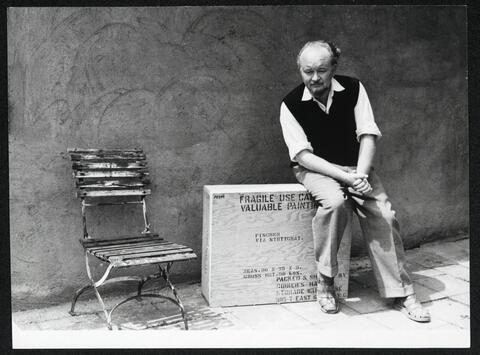 Sitzende Vollfigur im Viertelprofil nach rechts gewandt auf einer Terrasse. Cuno Fischer sitzt auf einer Transportkiste, er hat seine Hände zwischen seinen Knien verschränkt und trägt ein helles Hemd, dunkle Weste und helle Hosen. Zu seiner Linken steht ein Stuhl.