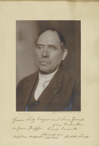 Lovis Corinth wurde am 21. Juli 1858 in der Stadt Tapiau in Ostpreußen (heute Russland) geboren. Im Alter von 18 Jahren besuchte er die Kunstakademie in Königsberg, wechselte aber 1880 an die Münchner Akademie. 1883/1884 reiste er nach Italien und für drei Monate nach Antwerpen, bevor er in den Jahren 1884 bis 1887 in Paris an der Académie Julian studierte. Zwischen 1891 und 1899 lebte Corinth als freier Maler in München und gehörte dort der Secession an. Nachdem er Max Liebermann und Walter Leistikow kennenlernte, reifte in ihm der Entschluss nach Berlin zu ziehen, wohin er 1901 übersiedelte. In Berlin eröffnete Lovis Corinth eine Malschule und unternahm Studienreisen nach Belgien und Holland. 1911 wurde er zum Vorsitzenden der Berliner Secession gewählt, noch im gleichen Jahr erlitt er einen Schlaganfall und war halbseitig gelähmt. In der Zeit der Rekonvaleszenz im Zeitraum zwischen 1912 und 1914 reiste Corinth an die Riviera, nach Südtirol, Italien und erholte sich soweit, dass er wieder malen konnte. Nach 1911 wandte er sich mit großem Interesse der Grafik zu und es entstanden eine Fülle an Radierungen und Lithografien, zudem Buchillustrationen. 1914 spaltete sich die Freie Secession von der Berliner Secession ab, wobei Corinth in der ursprünglichen Secession verblieb und ein Jahr später erneut deren Vorsitzender wurde. 1916/17 unternahm er Reisen nach Hamburg, an die Ostsee und nach Tapiau bis er 1918 Professor an der Akademie der Künste in Berlin wurde. 1919 baute er mit seiner Frau ein Landhaus am oberbayerischen Walchensee, das die nächsten Jahre als Rückzugsort diente. Im Juni 1925 reiste Lovis Corinth noch einmal nach Amsterdam, er erkrankte schwer an einer Lungenentzündung und verstarb am 17. Juli 1925 in Zandvoort.