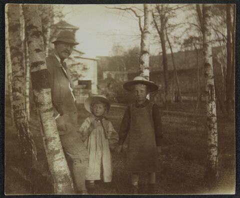 Richard Riemerschmid mit seinen Kindern Helmut und Ilse im Garten